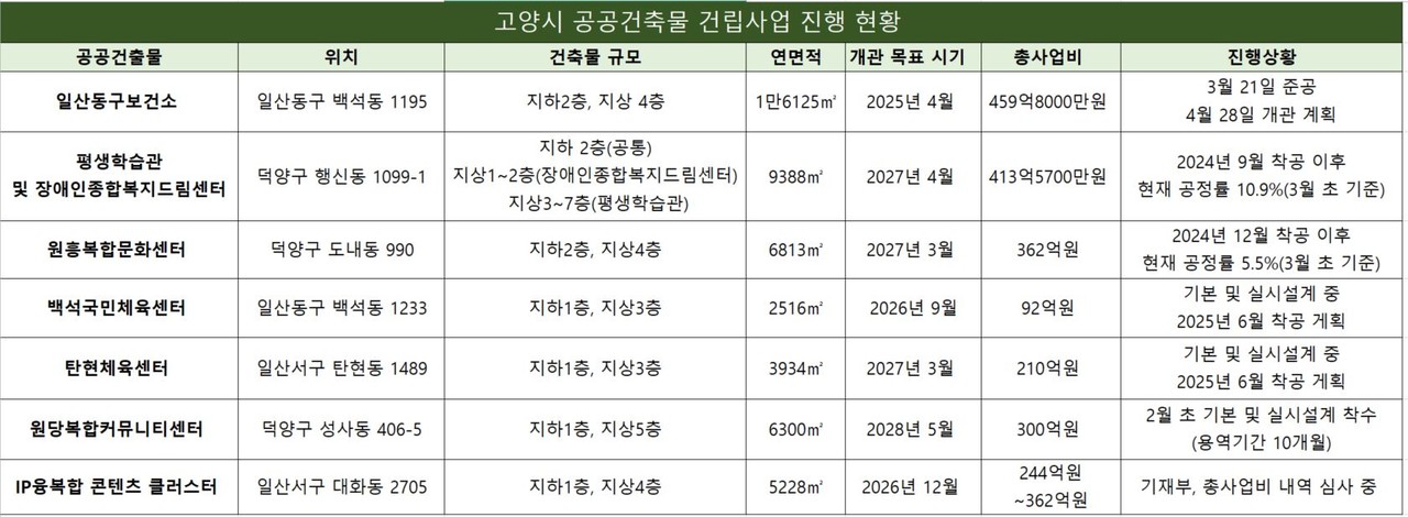 7개 중에서 사업진척이 가장 많이 된 것은 일산동구보건소로, 오는 4월 28일 개관을 앞두고 있다. 평생학습관 및 장애인종합복지드림센터, 원흥복합문화센터는 지난해 9월, 지난달 초에 각각 착공이 이뤄졌다. 나머지 4개는 모두 착공 전으로 현재 건축 설계 중이다.