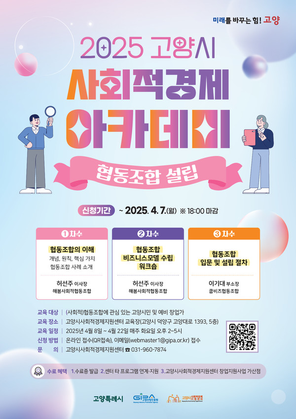 [고양신문] 고양산업진흥원(원장 한동균)이 운영하는 고양시사회적경제지원센터가 ‘2025년 고양시 사회적경제 아카데미 기초 과정 2기(협동조합 설립)’ 수강생을 모집한다.