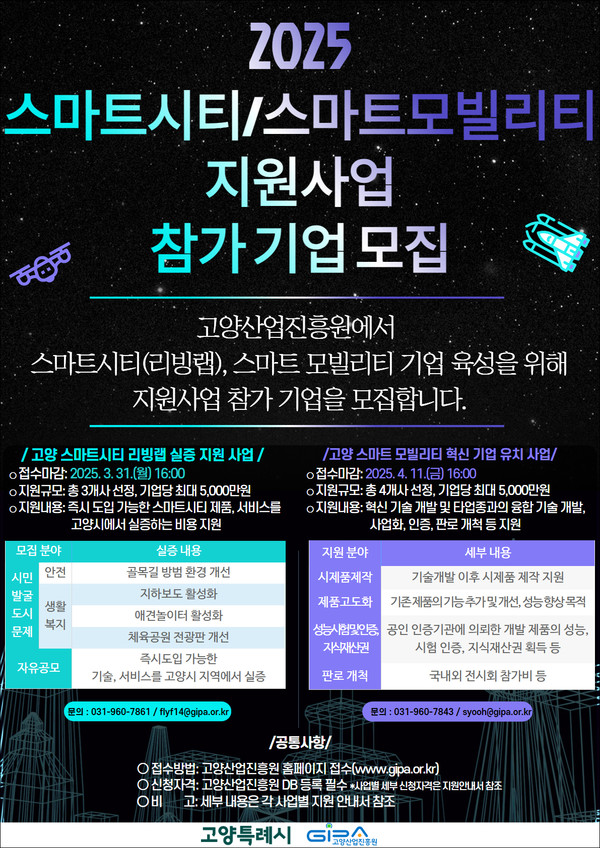 [고양신문] 고양시와 고양산업진흥원(원장 한동균)은 2025 고양시 스마트시티·스마트 모빌리티 지원사업에 참여할 기업을 모집한다.