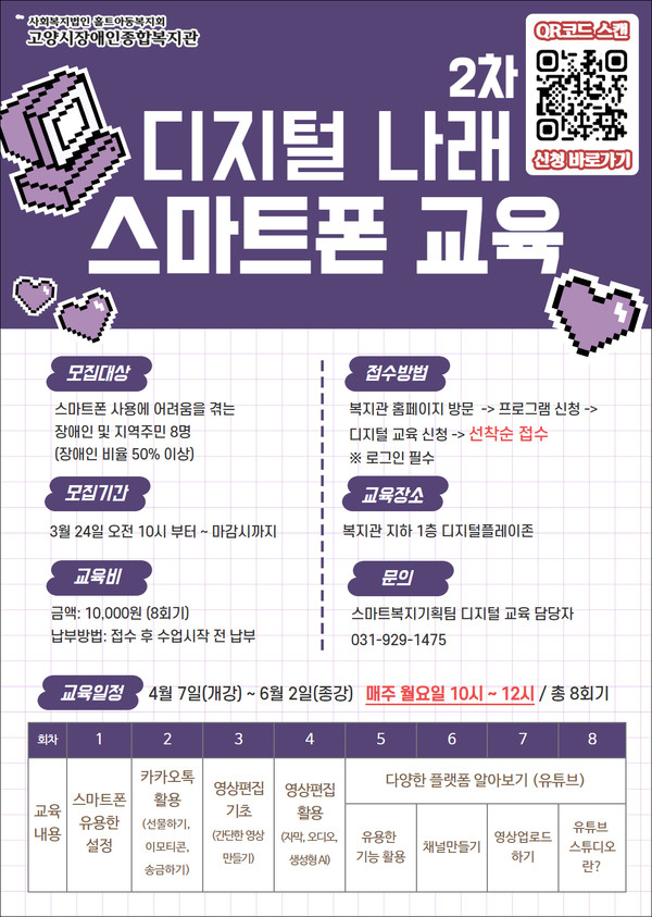 이번 교육은 스마트폰을 보다 편리하게 사용할 수 있도록 지원하는 것을 목표로 하며, 오는 4월부터 5월까지 고양시장애인종합복지관 디지털플레이존에서 진행한다. 교육 내용은 스마트폰 기본 기능(전화·문자·카메라 등) 활용법부터 카카오톡, 지도, 대중교통 앱 사용법, 모바일 뱅킹과 간편 결제, 개인정보 보호 및 보안 관리, 영상 편집까지 실생활에서 유용한 내용을 포함하고 있다.