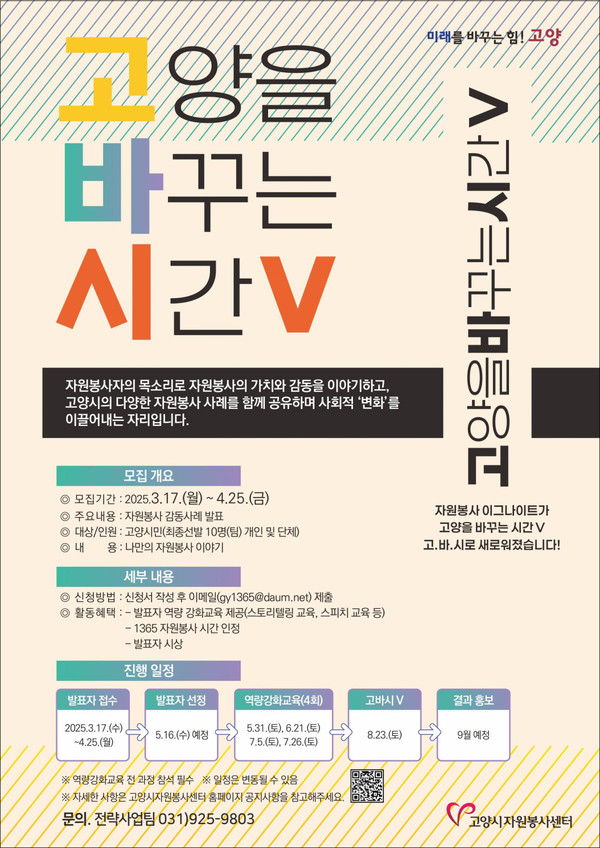 [고양신문] 고양시자원봉사센터는 오는 4월 25일까지 자원봉사 사례 공유회 ‘2025 고양을 바꾸는 시간 : 고바시 V’에 참가할 발표자를 모집한다.