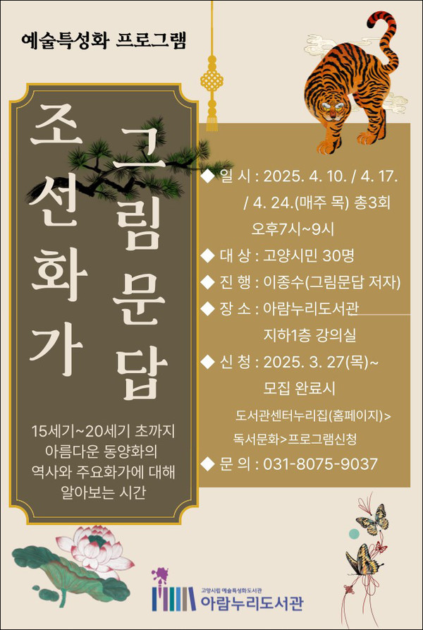 [고양신문] 아람누리도서관은 4월 10일부터 예술특성화 프로그램 ‘조선화가 그림문답’을 운영한다. 이 프로그램을 통해 15세기부터 20세기 초까지 당대를 대표하는 작품, 주요 화가와 삶, 역사적인 배경 등을 알아볼 수 있다. 강연은 2014년 군포시 올해의 책으로 선정된 『그림문답』의 저자 이종수 작가가 진행한다.