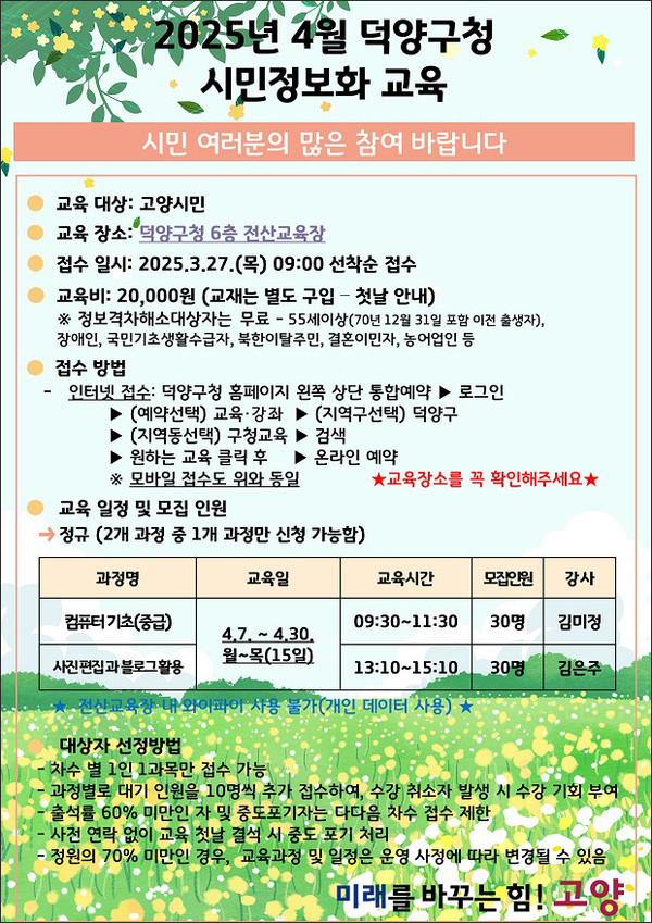 제3차 시민정보화교육은 4월 7일부터 30일까지 주 4일(월~목), 덕양구청 6층 전산교육장에서 진행되며 ▲컴퓨터 기초(중급) ▲사진 편집과 블로그 활용 과정으로 구성된다.