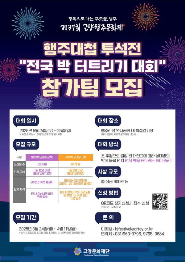 전국 각지의 누구나 팀을 이뤄 참가할 수 있는 박 터트리기 대회의 모집요강 등 참가신청에 대한 자세한 내용은 고양문화재단 누리집에서 확인하면 된다.