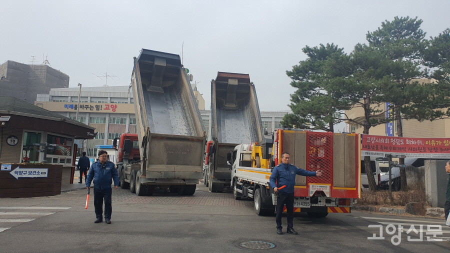 [고양신문] 25일 오후 3시 무렵, 25t 덤프트럭 2대와 중장비 운송트럭 1대가 고양시청 정문을 가로막는 상황이 발생했다. 트럭 3대가 정문의 진출입 양방향을 완전 봉쇄하는 바람에 민원인과 공무원들이 한동안 큰 불편을 겪었다.