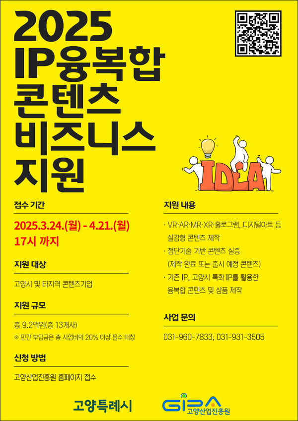 [고양신문] 고양시와 고양산업진흥원(원장 한동균)은 ‘IP융복합 콘텐츠 비즈니스 지원사업’ 참여기업을 4월 21일까지 모집한다. 이번 사업은 우수 콘텐츠 기업을 발굴·육성하고, 실감형 콘텐츠 결과물을 전시해 시민들에게 관람과 체험의 기회를 제공한다. 또한, 원천 IP를 활용해 산업·장르·기술 융합을 통한 2차 콘텐츠 제작을 지원하는 사업이다.