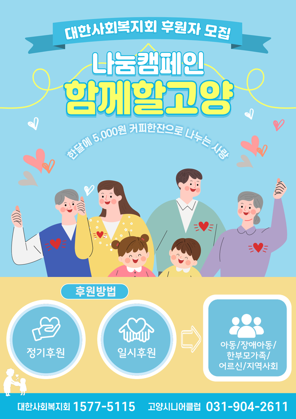 [고양신문] 고양시니어클럽(후원회장 김문향)은 오는 17일을 미래세대를 위한 사회복지법인 대한사회복지회 ‘함께할 고양(후원회)’ 홍보 DAY로 지정하고 따뜻한 나눔을 알리는 행사를 진행한다.