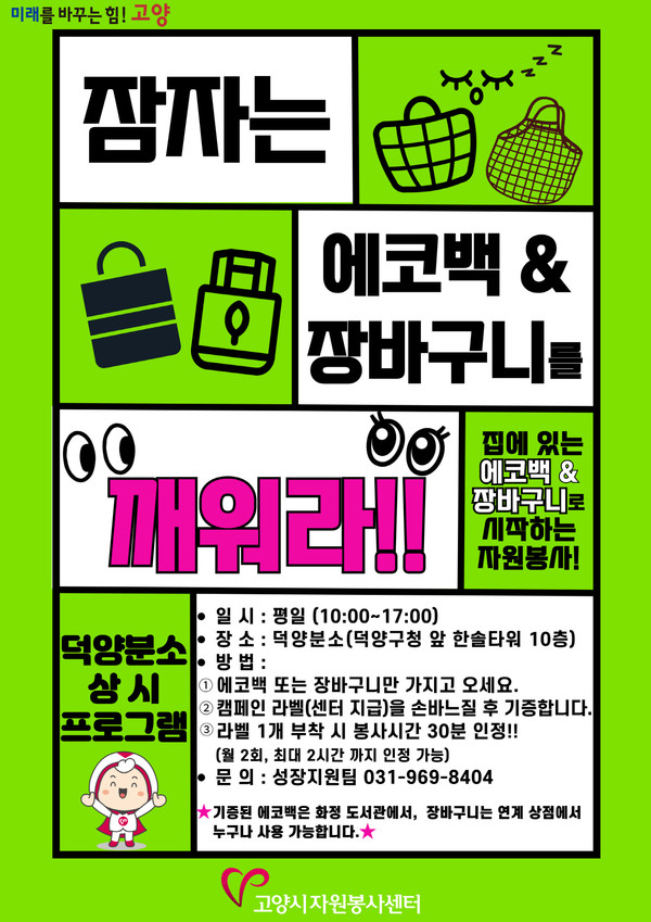 현재 센터는 운영 시간 중 누구나 참여할 수 있는 자원순환 캠페인 ‘잠자는 에코백 & 장바구니를 깨워라’를 진행하고 있다. 사용하지 않는 에코백이나 장바구니를 지참해 덕양분소를 방문하면 캠페인 라벨과 바느질 용품을 받을 수 있으며, 직접 라벨을 부착한 후 다시 제출하면 1개당 30분의 자원봉사 시간이 인정된다.