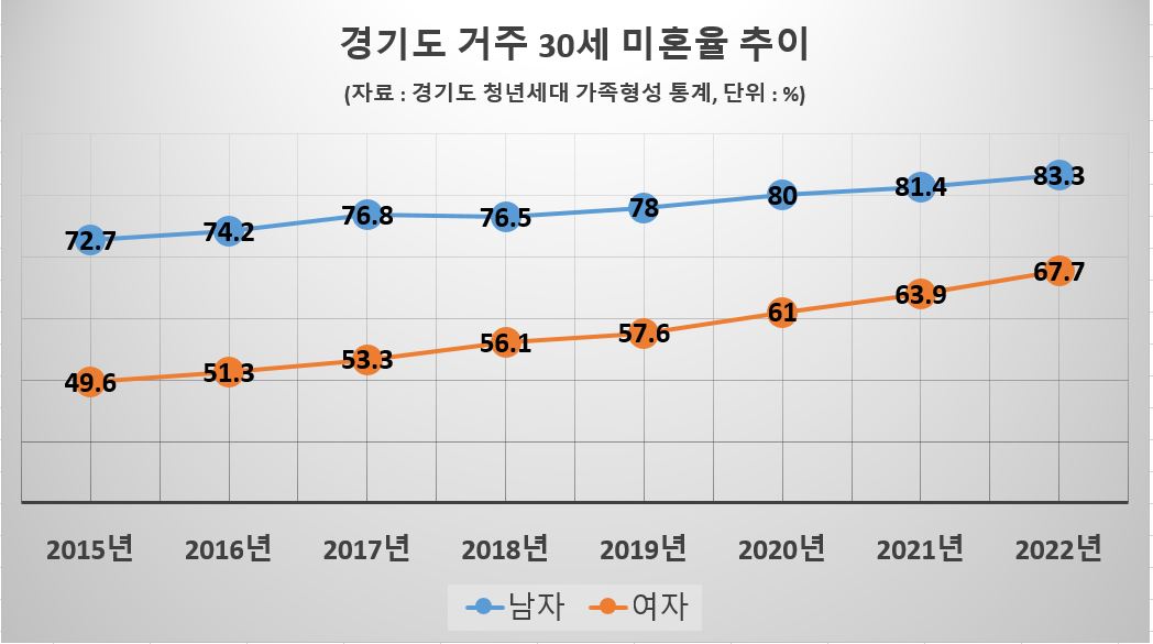 경기도 청년세대 가족형성통계에 따르면 경기도에 거주하는 2022년 기준 1983(39세)~1995(27세)년생 246만1961명 중 56.7%가 미혼이다. 성별로는 남성의 미혼율이 64.5%로 여성(48.1%)보다 더 높았다.