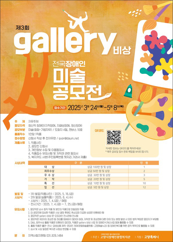 한편, ‘갤러리 비상’은 지적장애, 자폐성장애, 정신장애를 가진 전국의 등록장애인을 대상으로 자유 주제의 미술작품을 공모하며, 오는 3월 24일부터 5월 8일까지 작품을 접수한다. 총 33점의 수상작이 선정되며, 7월에는 고양시장애인종합복지관 내 ‘갤러리 비상’에서 전시될 예정이다. 공모전 관련 문의는 고양시장애인종합복지관 지역사회지원팀(031-929-1484)으로 하면 된다.