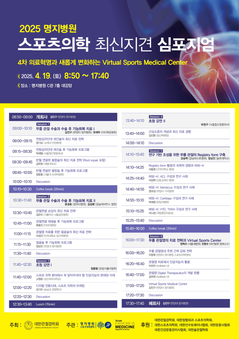 또 근감소증의 개념과 최신 치료 경향, 무릎 관절경 Registry form 구축 및 연구 기반 조성, 무릎 관절염 치료 전략과 Virtual Sports Center 등 다양한 주제가 발표된다.