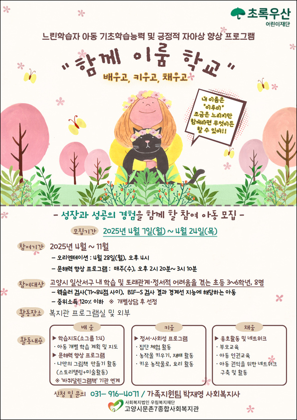 이번 사업은 초록우산 어린이재단 경기북부지역본부의 지원을 받아 진행되며, 느린학습 아동의 학교생활과 사회 적응력 향상을 도모하고 가족과 지역사회 지지망을 구축해 아동이 건강한 사회구성원으로 성장할 수 있도록 돕는 것을 목표로 한다.
