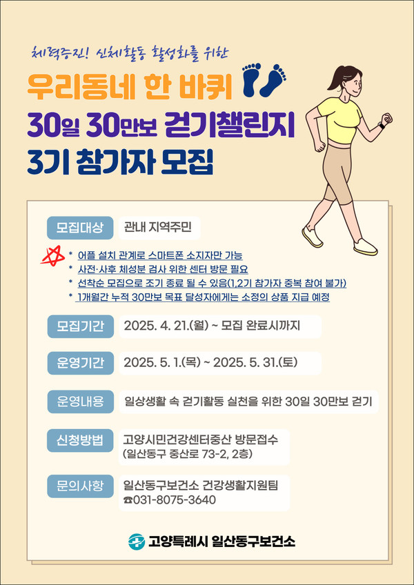 [고양신문] 일산동구보건소는 지역주민의 체력증진과 신체활동 활성화를 위해 2025년 우리동네 한 바퀴 30일 30만보 걷기챌린지 3기 참가자를 오는 21일부터 모집한다.