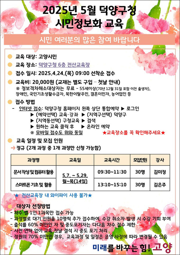 교육은 덕양구청 6층 전산교육장에서 있을 예정이며, 접수는 덕양구청 누리집에서 온라인으로만 가능하다. 각 과정은 선착순으로 30명씩 모집하며 2개 과정 중 1개 과정만 신청이 가능하다.