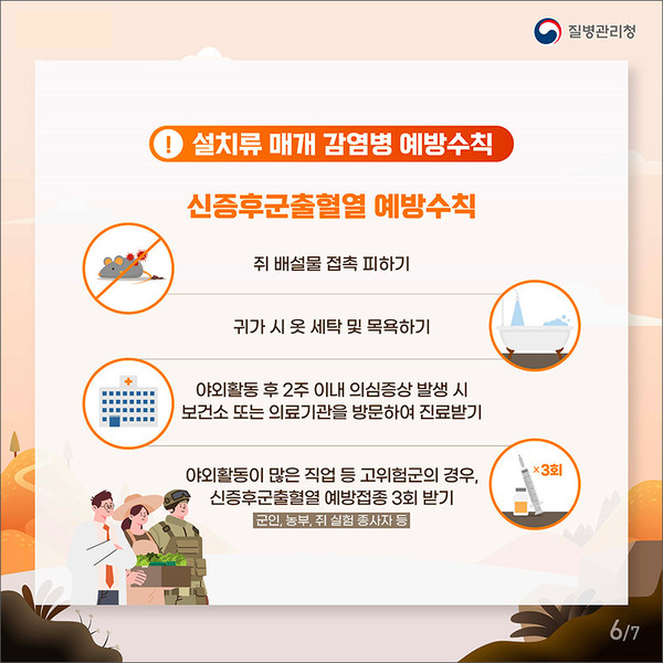 고양시보건소 관계자는 “특별한 치료 방법이 없는 신증후군출혈열은 예방이 중요하다. 농업 등으로 야외활동이 잦은 주민들은 필히 접종하고, 긴 옷·장갑·마스크·장화 등 보호장구를 착용하고 개인위생을 준수하는 등 감염 예방수칙을 생활화해야 한다”라고 당부했다.