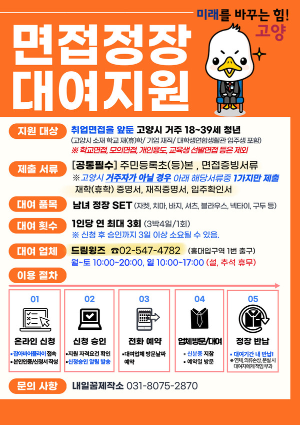[고양신문] 고양시는 지역 내 청년 구직자의 취업 준비 비용 부담을 줄이기 위한 ‘2025 면접정장 대여지원 사업’을 5월 1일부터 시작한다.