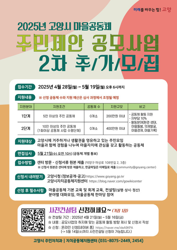 2차 추가모집에 참여하고자 하는 고양시민과 공동체는 오는 16일까지 진행되는 사전컨설팅을 신청해 공모사업에 대한 설명과 신청서 작성 안내를 받을 수 있다.