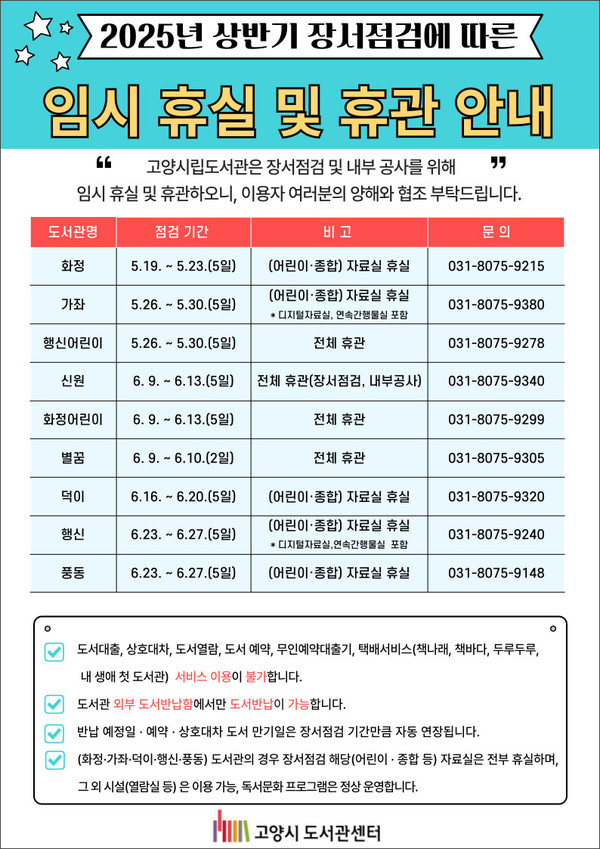 도서관별 장서점검 일정은 ▲화정도서관 : 5월 19 ~ 23일 ▲가좌도서관, 행신어린이도서관 : 5월 26 ~ 30일 ▲신원도서관, 화정어린이도서관 : 6월 9 ~ 13일 ▲별꿈도서관 : 6월 9 ~ 10일 ▲ 덕이도서관 : 6월 16 ~ 20일 ▲행신도서관, 풍동도서관 : 6월 23 ~ 27일이다.