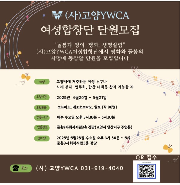 [고양신문] 고양YWCA(회장 김용주)가 여성합창단 단원을 모집한다. 노래와 연주로 삶을 활기차게 만들고, 나아가 음악으로 지역사회에 봉사하고자 하는 여성이면 누구나 환영한다. 신청자는 고양YWCA가 주관하는 오디션 절차를 거친 후 단원이 될 수 있다. 소프라노 메조소프라노 알토로 나눠 참여할 수 있다.