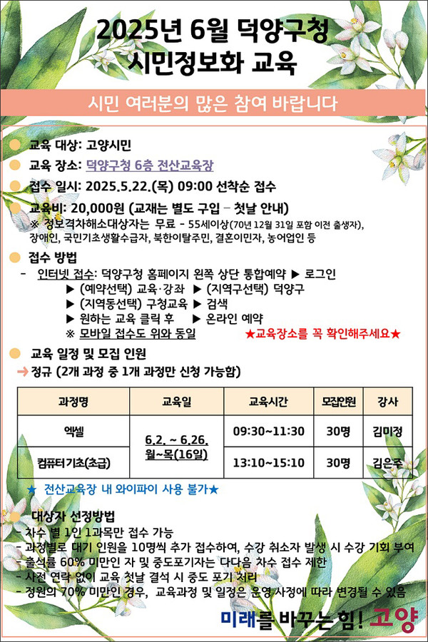 [고양신문] 덕양구는 고양시민을 대상으로 하는 제5차 시민정보화교육을 오는 22일 오전 9시부터 접수한다. 이번 교육은 6월 2일부터 26일까지 주 4일(월~목) 운영되며, 엑셀과 컴퓨터 기초(초급) 과정으로 진행된다.