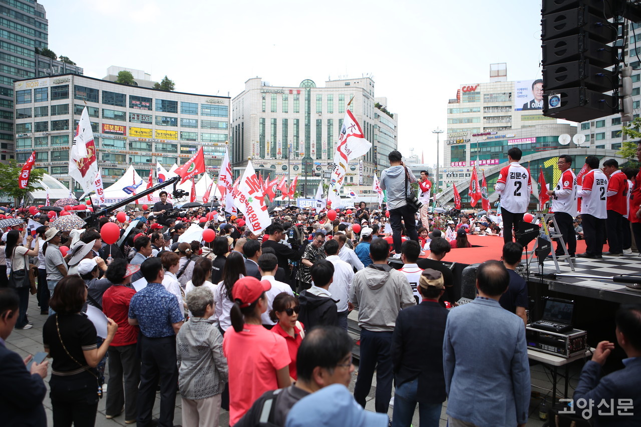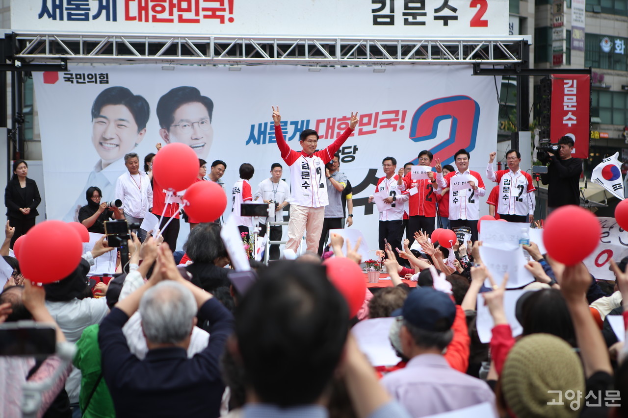 김문수 국민의힘 대통령 후보가 21일 덕양구 화정역 문화광장을 찾아 지지를 호소했다. 이날 김문수 후보는 단상에 오른 후 고양시민이 준 꽃바구니를 치켜들고 지난 11일 폐막한 고양국제꽃박람회를 언급하며 유세를 시작했다. ‘김문수, 대통령’을 연호하는 지지자들 앞에서 김문수 후보는 여러 가지를 약속하며 유세 분위기를 이끌었다.