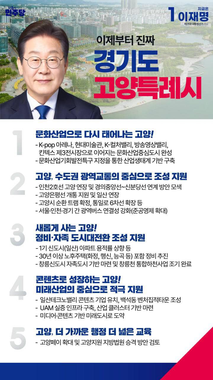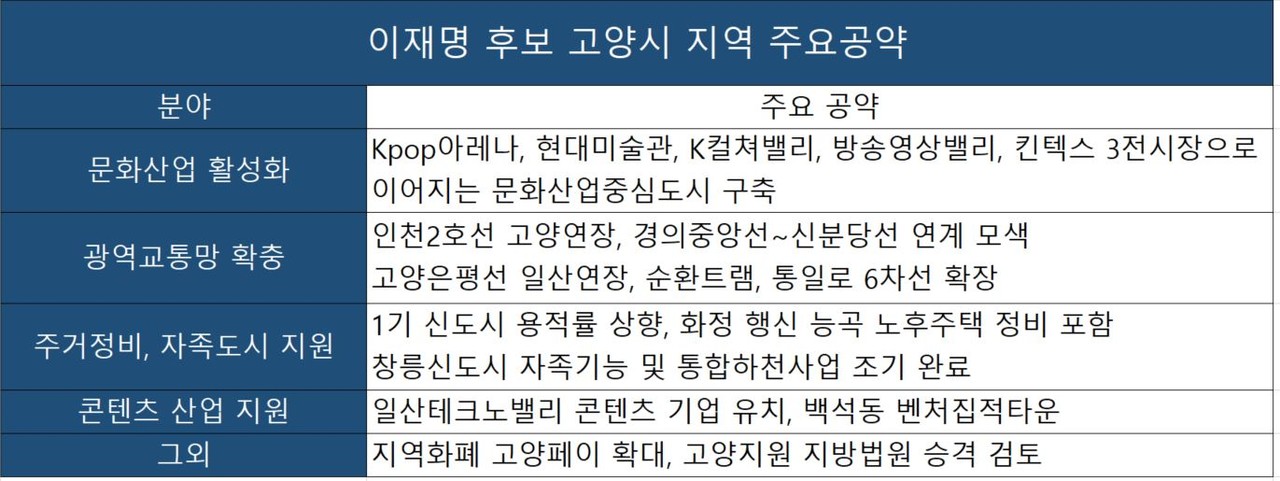 지난 19일 이재명 후보 캠프는 고양시를 위한 맞춤형 지역공약으로 △문화산업으로 다시 태어나는 고양 △수도권 광역교통 중심 조성 지원 △정비·자족 도시대전환 조성 지원 △콘텐츠 중심 성장 지원 △고양페이 확대 및 고양지원 지방법원 승격 검토 등 5대 공약을 발표했다. 이번 대선에서 고양시를 대상으로 한 구체적인 지역공약을 발표한 건 현재까지(22일 기준) 이재명 후보가 유일하다.
