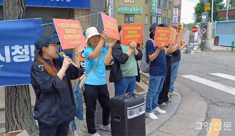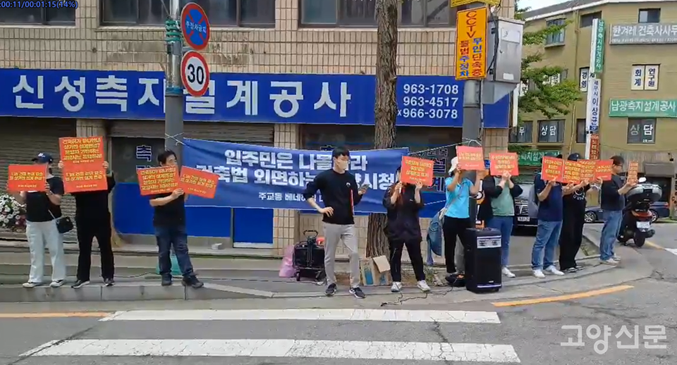 [고양신문] 덕양구 주교동에 신축 중인 베네하임 더힐 오피스텔을 분양받은 수분양자(대표 김선화)들이 21일부터 고양시청 앞에서 해당 건물의 ‘오피스텔-상가 분리 설계변경’ 반대를 주장하며 시위를 시작했다. 첫날 오전 시청 정문 앞에 모인 20여 명의 집회 참가자들은 “수분양자 동의 없이 설계변경 절대 불가” “수분양자 기만하는 고양시는 응답하라” 등을 외치며 이동환 시장과의 면담을 요청했다. 이들은 22일에도 시위를 이어갔다.