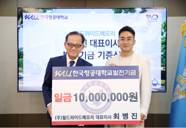 [고양신문] 한국항공대학교가 22일 대학 본관 이사장실에서 ㈜월드와이드메모리 최병진 대표이사의 발전기금 기증식을 개최했다. 이날 기증식에서 최 대표는 한국항공대의 교육환경 개선과 인재 양성을 위한 발전기금 1000만원을 전달했다.