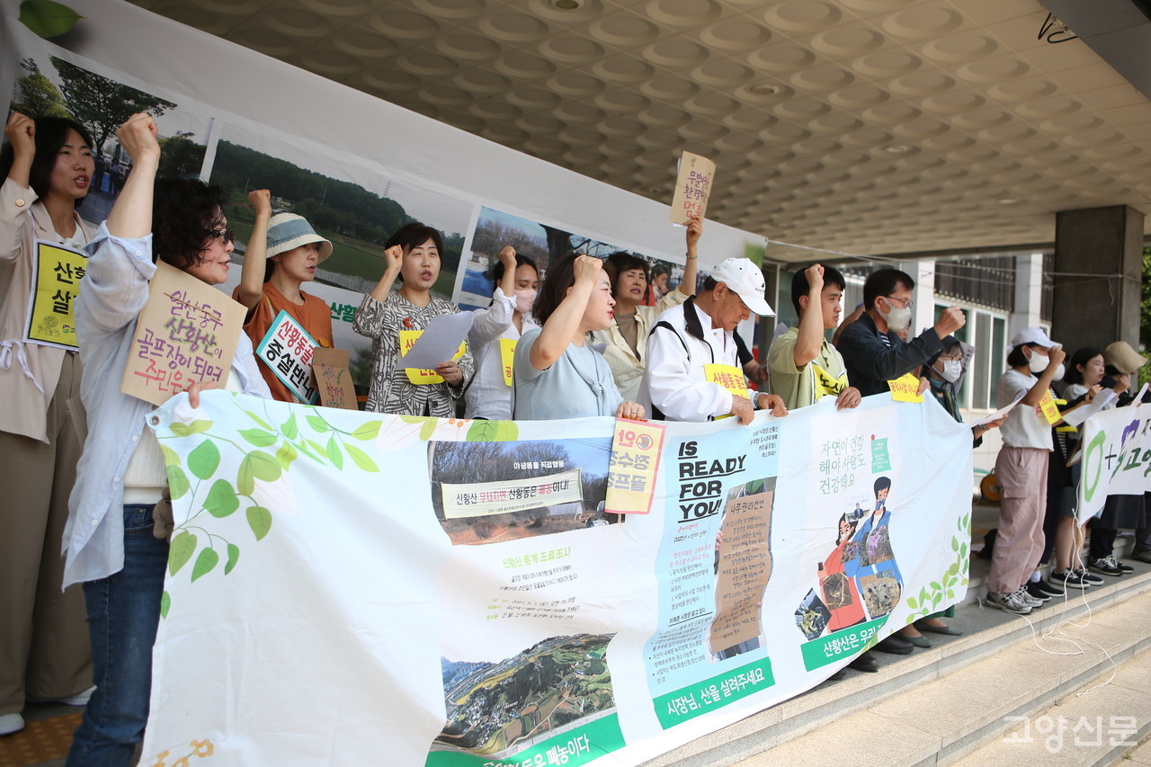 조정 고양환경운동연합 의장은 이날 기자회견문을 낭독하며 도시관리계획 직권취소 요구 이유를 알렸다. 조정 의장은 “산황산 보전은 이동환 시장의 인공림 조성, 탄소자연숲 조성이라는 주요정책과 연계성을 가진다. 막대한 예산을 투입해도 효과를 발휘하기까지 긴 시간이 요구되는 인공림과 다른 자연숲이며, 골프장 취소라는 정당한 행정행위만으로 환경 순기능이 정착된다”고 전했다.