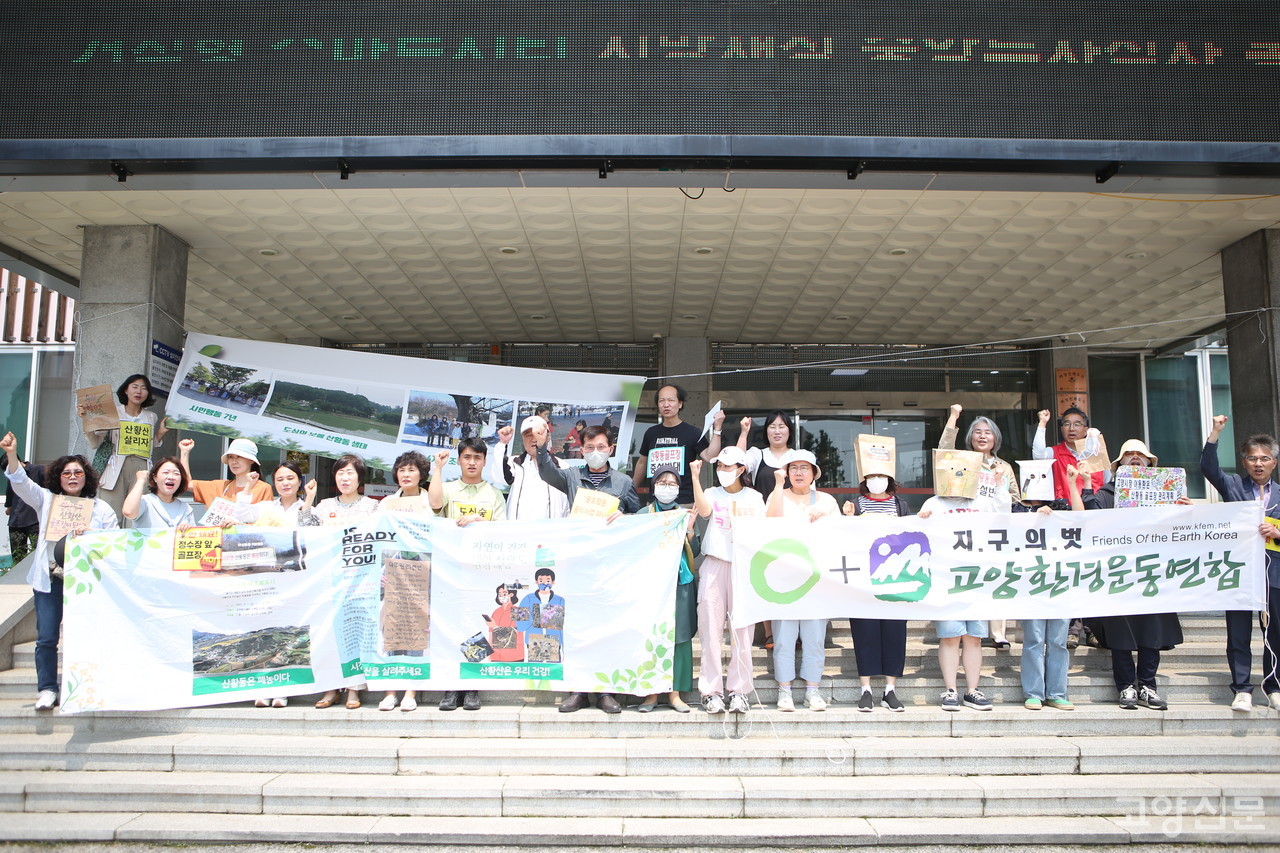 ‘산황산골프장백지화범시민대책위’라는 이름으로 모인 시민들이 27일 고양시청 본관 계단에서 산황산을 지키려는 마음에서 모두 한마디씩 했다. 고양환경운동연합, 고양YWCA, 나들목일산교회, 동녘교회, 노동당 등 지역 여러 단체가 모여 구성한 대책위는 이날 이동환 고양시장이 산황산 골프장 도시관리계획에 대한 직권취소를 할 것을 촉구했다.