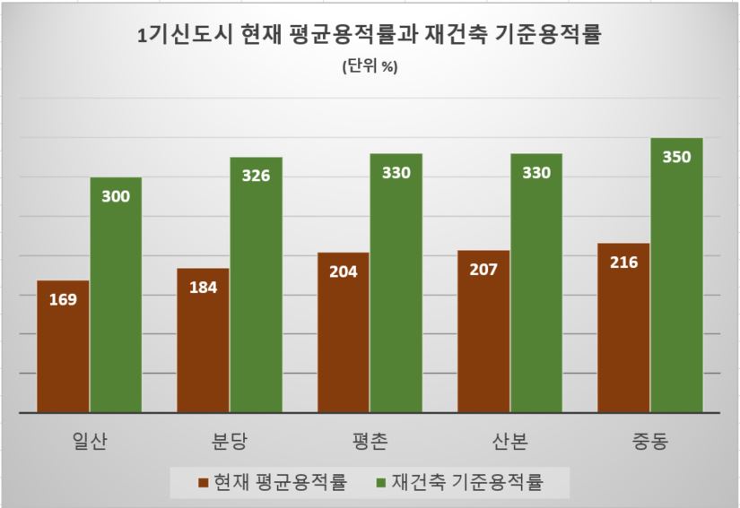 하지만 5개 1기신도시 가운데 일산의 기존 용적률이 가장 낮게 설정됐기 때문에 주민들의 불만이 표출되고 있는 상태다. 아파트만을 놓고 보았을 때 일산 아파트의 기준용적률이 300%인데 반해 분당 326%, 평촌·산본 330%, 중동 350%으로 모두 상대적으로 높다.