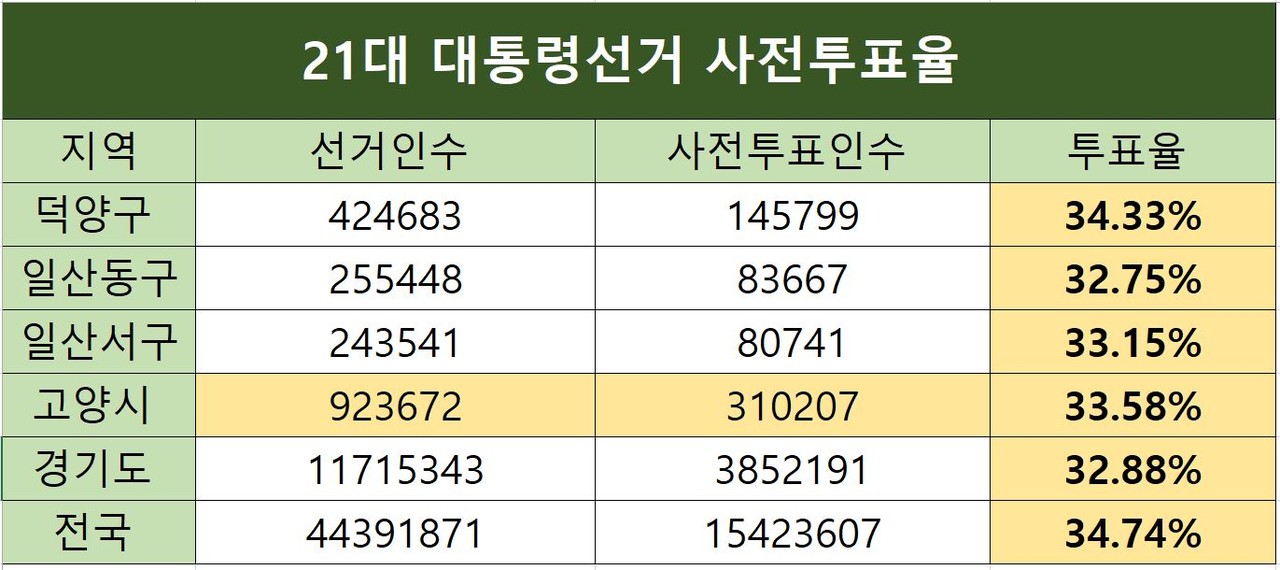 [고양신문] 제21대 대통령 선거 사전투표 둘째날인 30일 투표가 마감된 가운데 고양시의 누적 최종투표율이 33.58%을 기록했다. 고양시의 투표율은 전국평균 투표율(34.74%)에 비해 낮았지만 경기도 투표율(32.88%)에 비하면 높았다. 또한 지난 20대 고양시 사전투표율(34.38%)보다 다소 낮은 수치다.