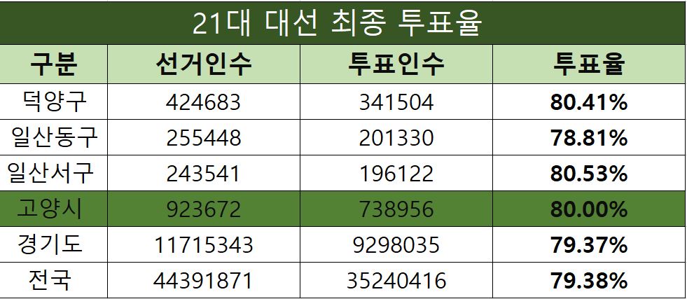 [고양신문] 제21대 대통령선거에서 고양시 최종 투표율은 80.0%로 집계됐다. 고양시 투표율은 경기도평균 투표율(79.37%), 전국평균 투표율(79.38%)에 비해 모두 높았다.