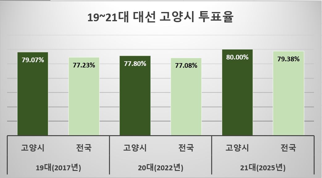 이번 고양시 투표율은 지난 2022년 3월 치러진 제20대 대선 고양시 투표율(77.80%)과 지난 2017년 5월 치러진 제19대 대선 고양시 투표율(79.07%)에 비해서도 높게 나타났다.