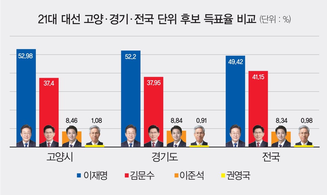 [고양신문] 경기도지사 출신 거대 양당 후보가 맞붙은 제21대 대통령선거에서 고양시 유권자는 전국 유권자의 평균적 표심에 비해 이재명 대통령에게 상대적으로 높은 지지를 보낸 것으로 나타났다. 이 대통령은 전국 득표율에서 과반을 넘기지 못한 반면 고양시에서는 과반을 훌쩍 넘겼다.