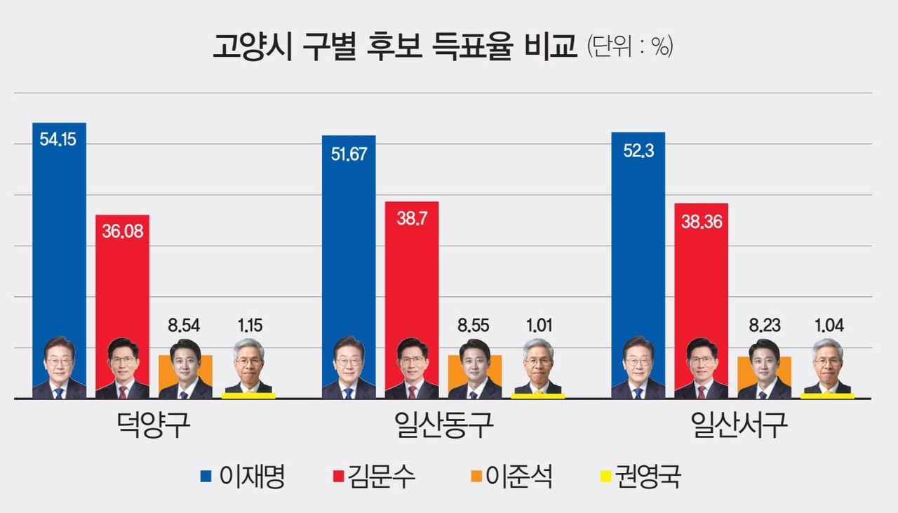 반면 김문수 국민의힘 후보는 고양시에서 27만4508표를 얻어 37.40%의 득표율을 얻는 데 그쳤다. 고양시만 놓고 보면 두 후보 간 득표율 차이는 15.58%p(11만4368표)다. 이는 두 후보의 전국 득표율 차이인 8.27%p의 2배 가까운 수치다. 전국 득표율을 보면 이 대통령이 49.42%, 김 후보가 41.15%를 나타냈다.