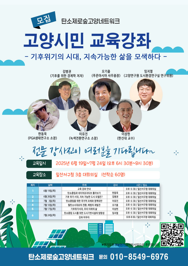 총 6회로 진행되는 이번 교육에는 △한동욱 PGA생태연구소 소장 △김병권 『기후를 위한 경제학』 저자 △이유진 녹색전환연구소 소장 △오기출 푸른아시아 사무총장 △이상헌 한신대 교수 △임지열 고양연구원 도시환경연구실 연구위원 등 각계 전문가들이 강의를 맡았다. 신청 문의 010-8549-6976