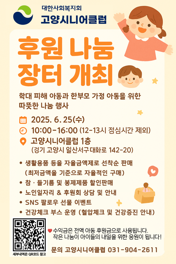 [고양신문] 고양시니어클럽(관장 신우철)은 오는 6월 25일, 학대 피해 아동과 한부모가정 아동을 지원하기 위한 ‘함께할고양’ 후원 나눔장터를 개최한다. 이번 행사는 지역 어르신들과 시민이 함께하는 나눔 실천의 장으로 마련됐다.