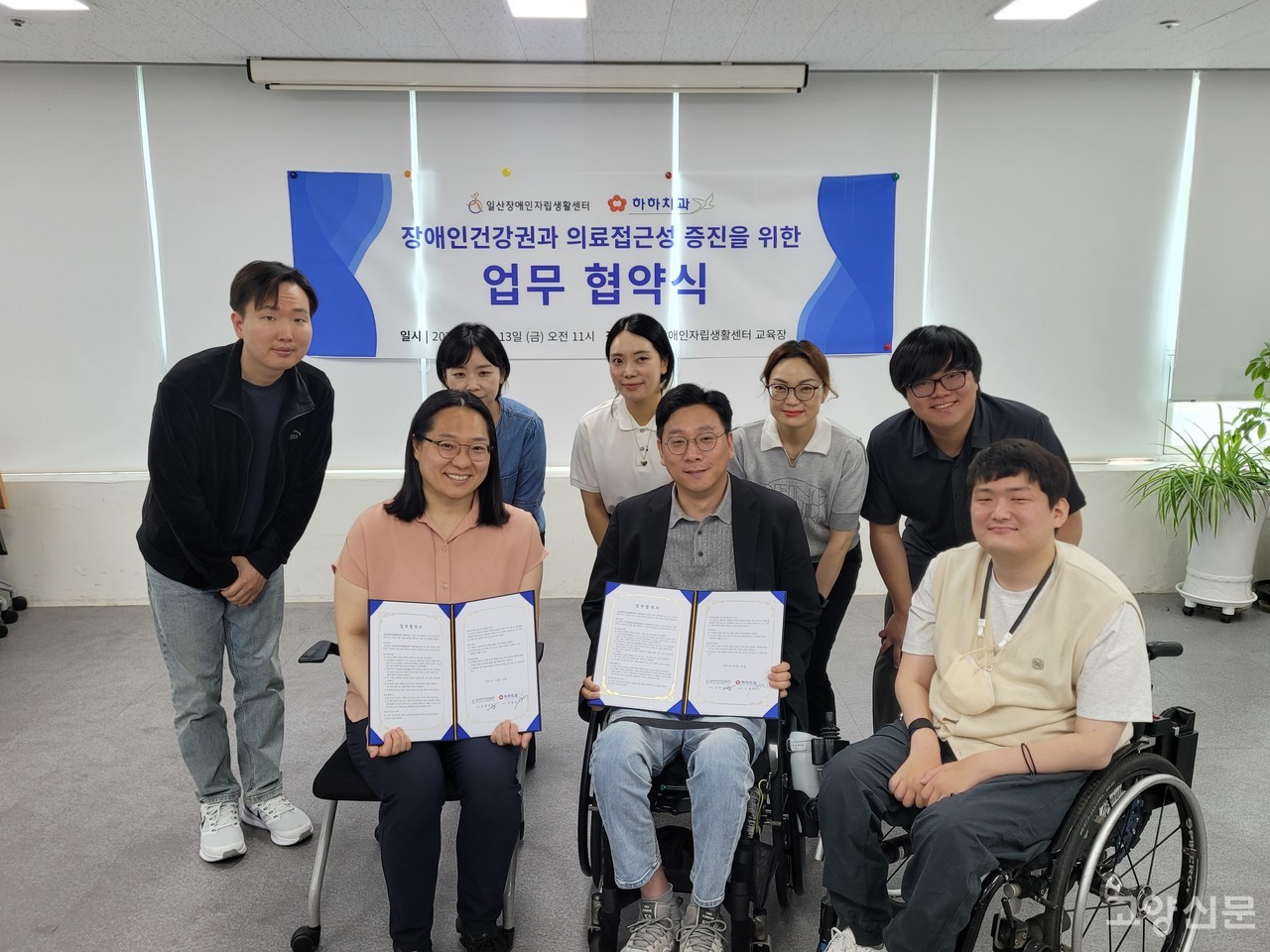 [고양신문] 일산장애인자립생활센터(대표 김재룡, 이하 ‘일산IL센터’)와 하하치과(원장 김명옥)는 지난 13일 장애인의 건강권과 의료접근성 증진을 위한 업무협약을 체결했다.