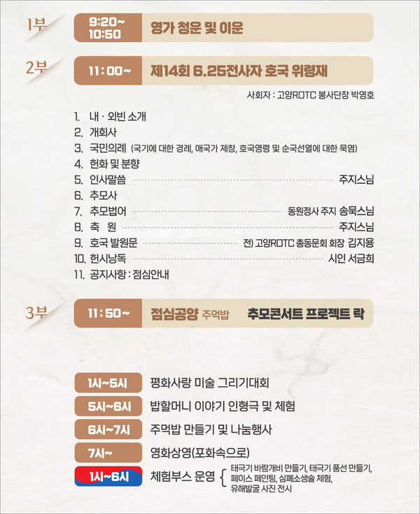 행사는 1부 영가청운과 이운 행사의 시작으로, 11시부터는 제14회 6·25 전사자 호국 위령재가 봉행될 예정이다. 11시50분부터는 점심공양과 추모콘서트가 진행되고, 오후 1시부터는 ‘평화사랑 미술 그리기 대회’가 시작되며, 이어 오후 5시부터는 ▲밥할머니 이야기 인형극 및 체험 ▲주먹밥 만들기와 나눔 행사 ▲영화 '포화 속으로' 상영이 진행된다. 행사 시간 내내 체험 부스도 함께 운영되며 ▲태극기 바람개비 및 풍선 만들기 ▲페이스 페인팅 ▲심폐소생술 체험 ▲유해 발굴 사진 전시 등 다양한 프로그램이 준비돼 있다.