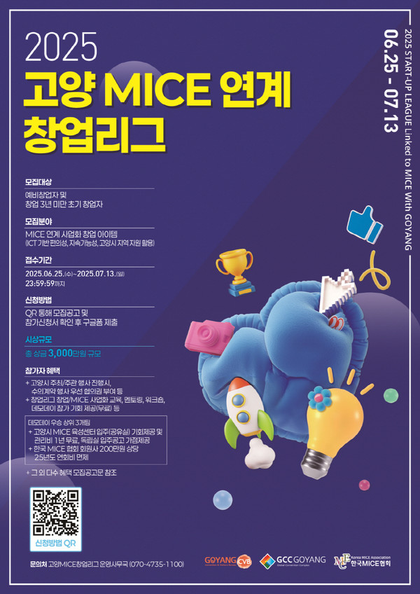 [고양신문] (사)고양컨벤션뷰로는 ‘2025 고양 MICE 연계 창업리그’ 참가팀을 7월 13일까지 모집한다. 이번 창업리그는 국제회의, 전시회, 기업 미팅, 인센티브 투어 등 MICE 산업과 연계된 혁신적인 아이디어와 창업 아이템을 가진 예비 창업자와 초기 창업자(창업 3년 미만)를 대상으로 진행된다.