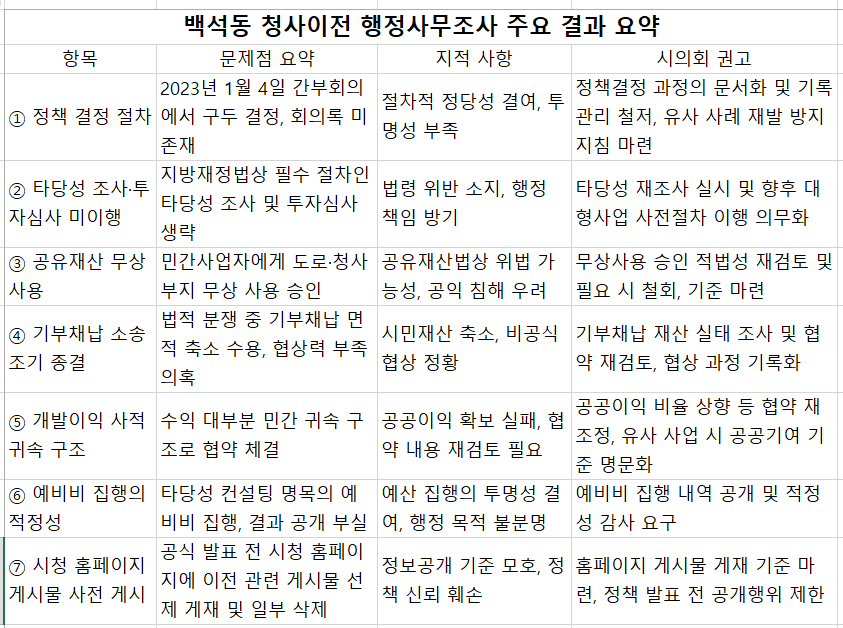 시의회 백석 시청이전 행정사무조사 결과보고서 살펴보니