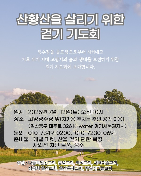 기도회에는 시민 누구나 참여할 수 있으며, 12일 오전 10시까지 고양정수장(일산동구 대주로 326) 앞으로 오면 된다. 주최 측은 “산길을 걷기 편한 복장, 모자나 양산, 물 등을 챙겨와주시고, 산황산 골프장 증설을 반대하는 개별 피켓을 준비해 오셔도 좋다”고 설명했다. 문의 010-7349-0200