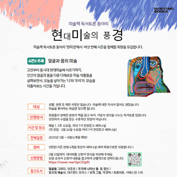 2025년 3월부터 시작된 상반기 시즌6의 주제는 ‘얼굴과 몸의 미술’. 인물화, 자화상, 해부학적 표현, 젠더와 몸의 재현, 퍼포먼스 아트 등 다양한 시기의 작품과 이론을 통해 인간 형상의 의미를 탐색하고 있다. 이번 시즌에서는 ‘얼굴을 그리다(정중원)’, ’조각에 나타난 몸(톰 플린)‘, ’포즈의 예술사(데즈먼드 모리스)‘, ’오직 그림(박영택)‘, ’프로이트(시베스천 스미), 등을 중심으로 이야기를 펼쳐가고 있다.