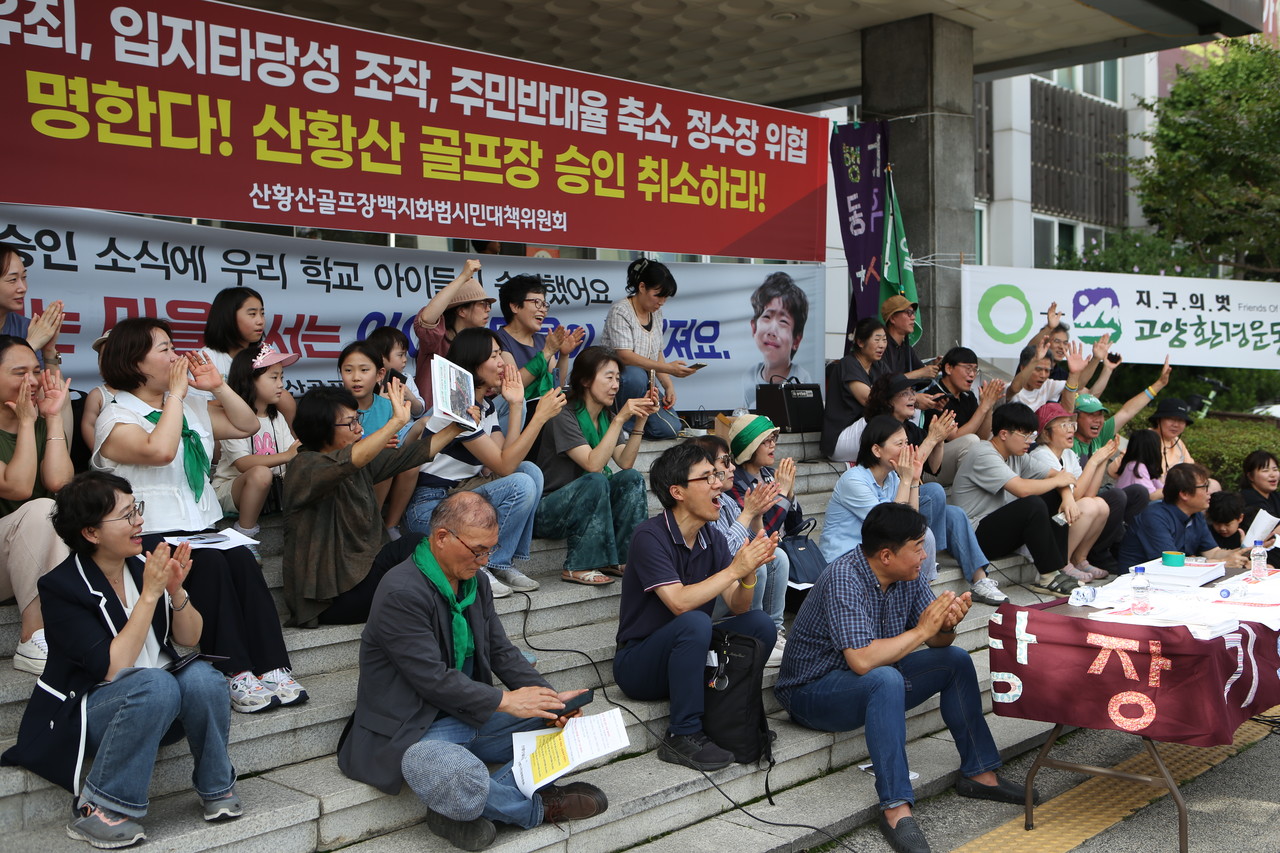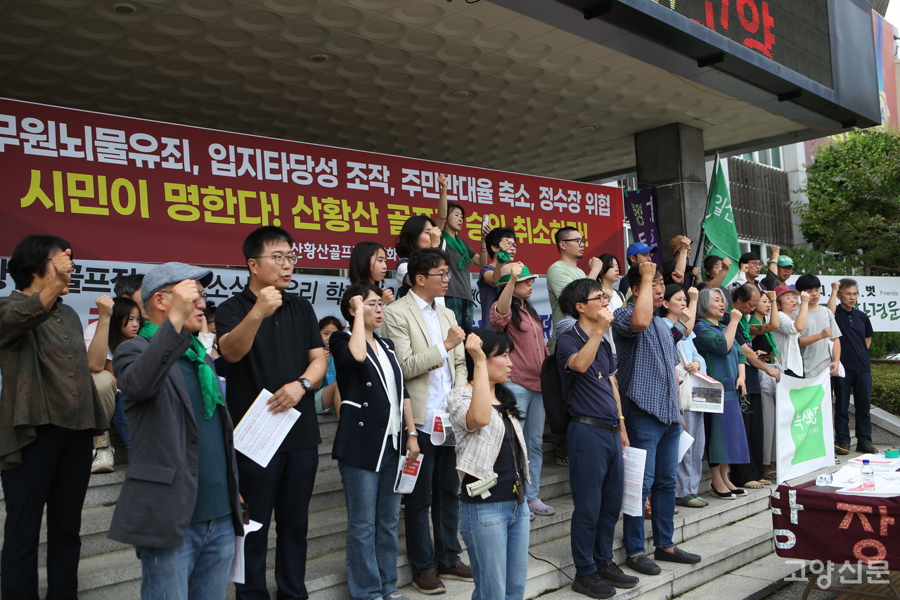 고양환경운동엽합 측도 입장문을 통해 “산황산은 도심 속 귀중한 생태계이며 다양한 생명들이 숨 쉬는 삶의 공간이다. 시민들은 이곳에서 자연과 교감하며 회복과 위로를 얻고 생명의 고리로 연결되어 있는 인간과 비인간 생물의 조화로움을 배운다. 도심의 산을 밀어 골프장을 개발하는 일은 전통이 깊은 인문대학을 파괴하는 것과 같다”면서 “이동환 고양시장에게 실시계획인가 승인 철회를 요구한다”고 밝혔다.
