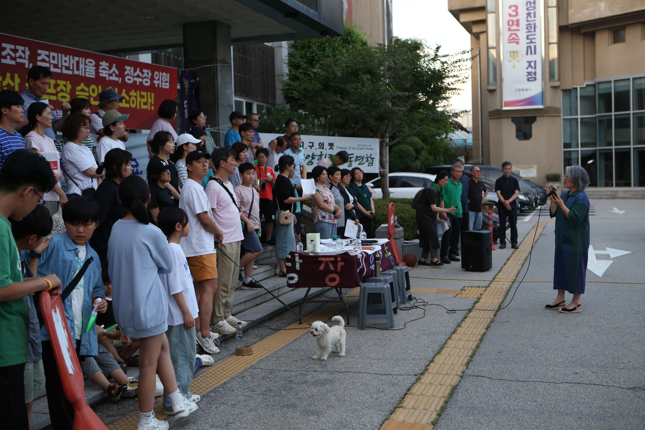특히 대곡초 1학년인 전승리군은 “저는 아침마다 새소리를 듣고 맑은 공기를 마시며 친구들과 자연 속에서 뛰어노는 걸 좋아합니다. 그런데 지금 산황산에 골프장을 짓는다고 합니다. 그 골프장은 고양정수장에서 300m밖에 안 되는 가까운 거리에 있습니다. 깨끗한 물을 마시고 싶습니다. 이동환 시장님 골프장을 멈춰주세요”라고 말해 많은 박수를 받았다.