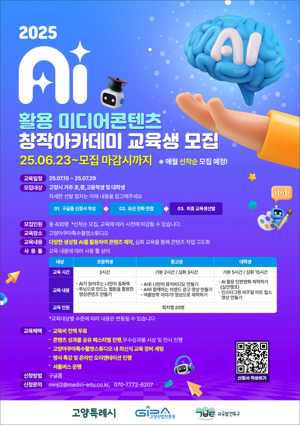 프로그램 기획에는 고양시와 진흥원은 물론 고양시청소년재단 등 지역 기관들이 대거 참여했다. 아카데미는 초·중·고 및 대학생 대상 맞춤형 교육으로 진행된다. AI 활용해 뮤직비디오·광고영상·단편영화 만들기, 릴스 영상 만들기 등 총 7개 과정으로 구성됐으며, 과정 당 2~15시간이 소요된다.