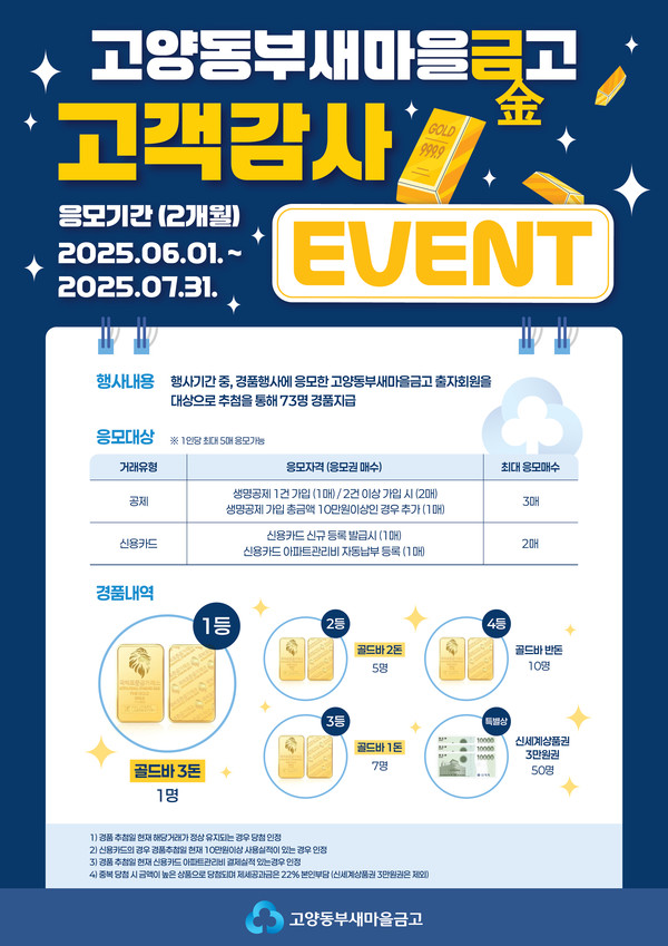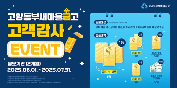 고양동부새마을금고는 고객과의 신뢰를 바탕으로 정성어린 금융서비스와 더불어 일상 속 특별한 기쁨을 전하고 있으며, 이번 이벤트로 더 많은 고객이 따뜻한 혜택과 황금 같은 행운을 함께 누리길 기대하고 있다.
