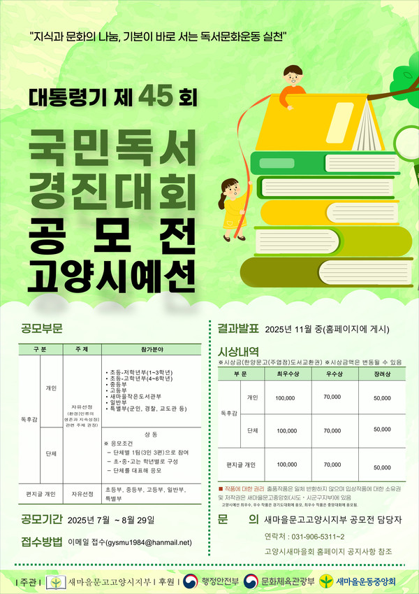새마을문고고양시지부 관계자는 “책을 읽고 글로 표현하는 과정을 통해 건강한 독서문화가 고양시 전역에 퍼지길 바란다. 우리 고양시민 여러분의 많은 관심과 참여를 바란다”라고 전했다. 기타 문의는 국민독서경진대회 담당자(031-906-5311~2)에게 하면 된다.