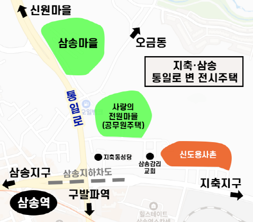 오송산 언덕 맨 아래기슭에 터를 잡은 신도용사촌의 골목길은 공무원주택과는 반대 구조다. 수평으로 뻗은 마을 아래쪽 메인 도로에서 낮은 경사도의 샛길이 위쪽으로 올라가고, 샛길 끝은 두세 개의 대문이 마주보며 막혀 있는 모양이 반복된다. 수평 구조의 용사촌과 수직 구조의 공무원주택을 직접 이어주는 유일한 길은 마을의 랜드마크 중 하나인 삼송감리교회 앞 경사로다.